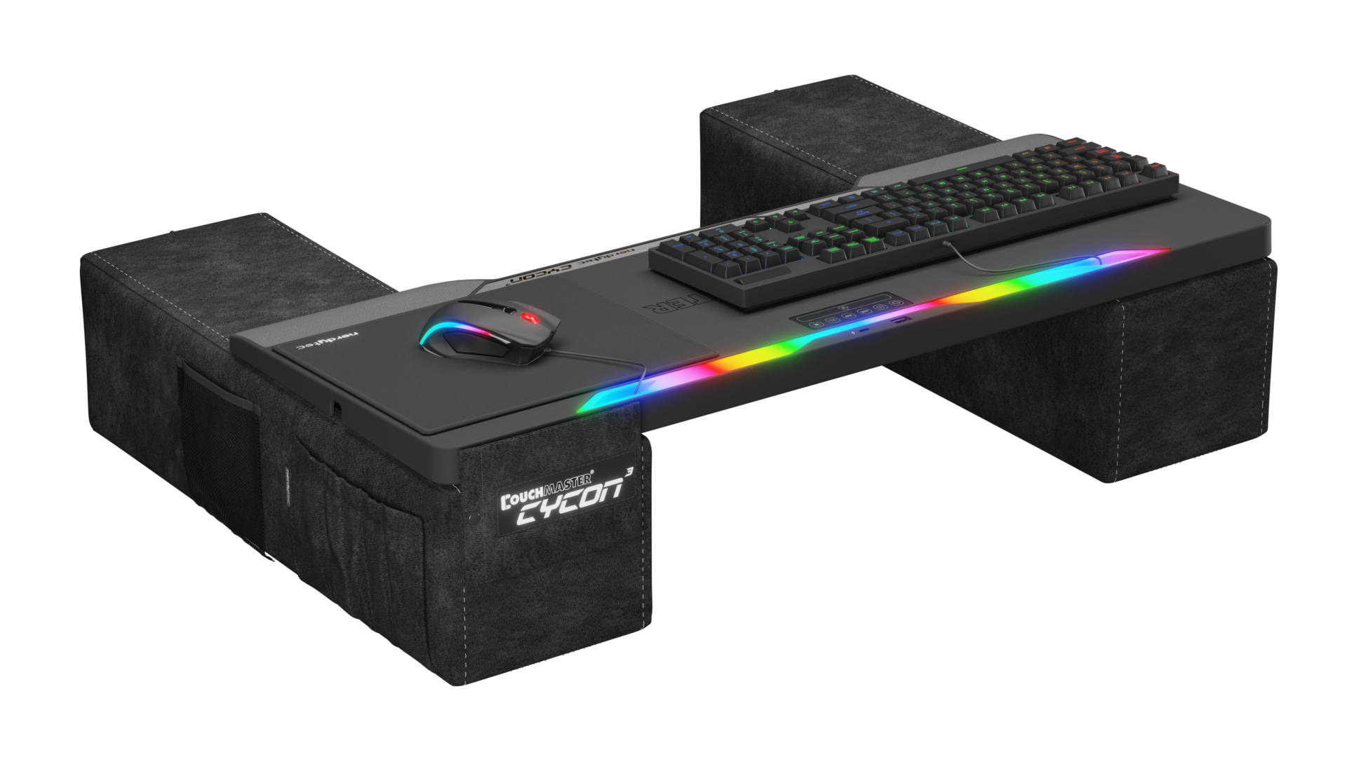 The CYCON³, part of the CYCON line of couch desks for mouse and keyboads, is the equipped with a colorful LED light bar with a touch control panel and optimized fast-charging ports up to 30W, combined with nerdytec’s patented ergonomic design — and more side pockets to store peripherals.